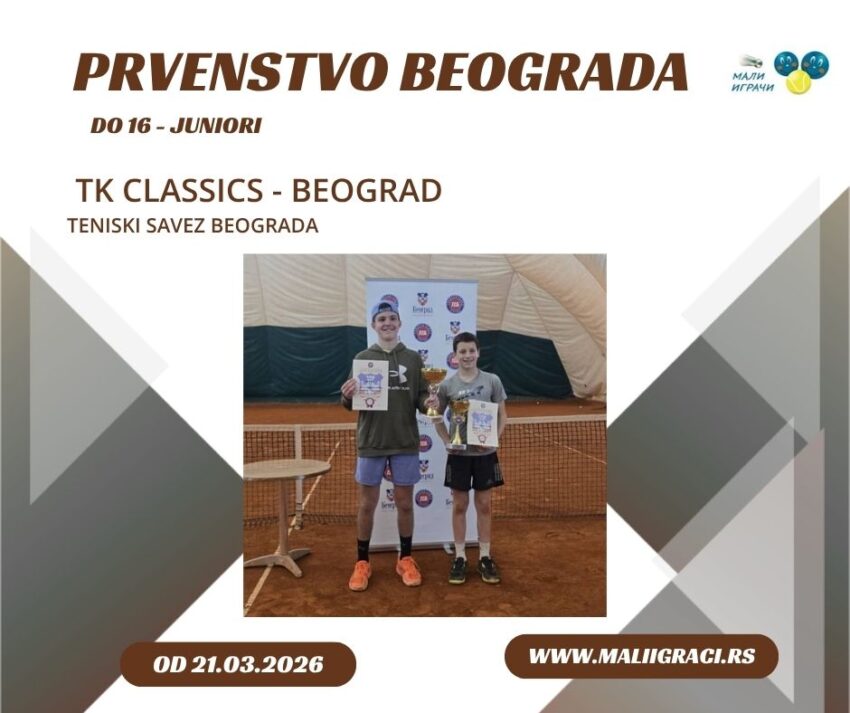 Prvenstvo Beograda, turnir B kategorije za juniore do 16 godina, igra se od 21. marta 2026. godine u TK Classics, Beograd u okviru kalendara Teniskog Saveza Beograda. Pratimo turnir zajedno! Aleksa Svičević pobednik je turnira. Drugoplasirani je Petar Travica, dok su treće mesto podelili Miloš Uzelac i Jovan Travica. Rezultate i informacije sa ovog turnira... Детаљније