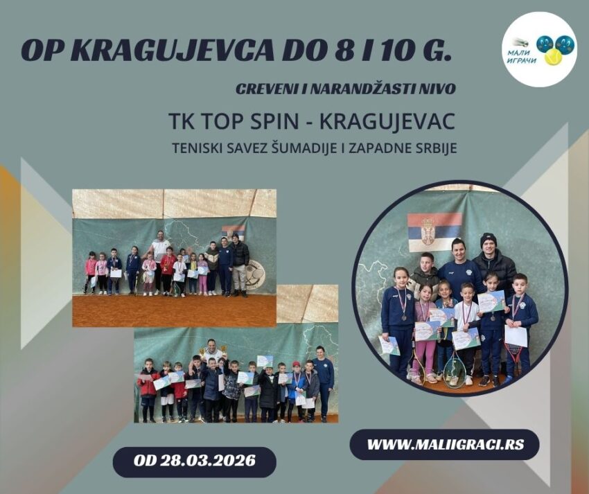 OP Kragujevca , turnir crvenog i narandžastog nivoa zа dečake i devojčice dо 8 i 10 godina, igra se 28. marta 2026. godine u ТK Top Spin, Kragujevac, u okviru kalendara Teniskog saveza Šumadije i zapadne Srbije. Turniri se igraju na šljaci. Budite uz Male Igrače! Crveni nivo:MVP Maksim Milivojević FER PLEJ Nikolina Mitić Narandžasti... Детаљније