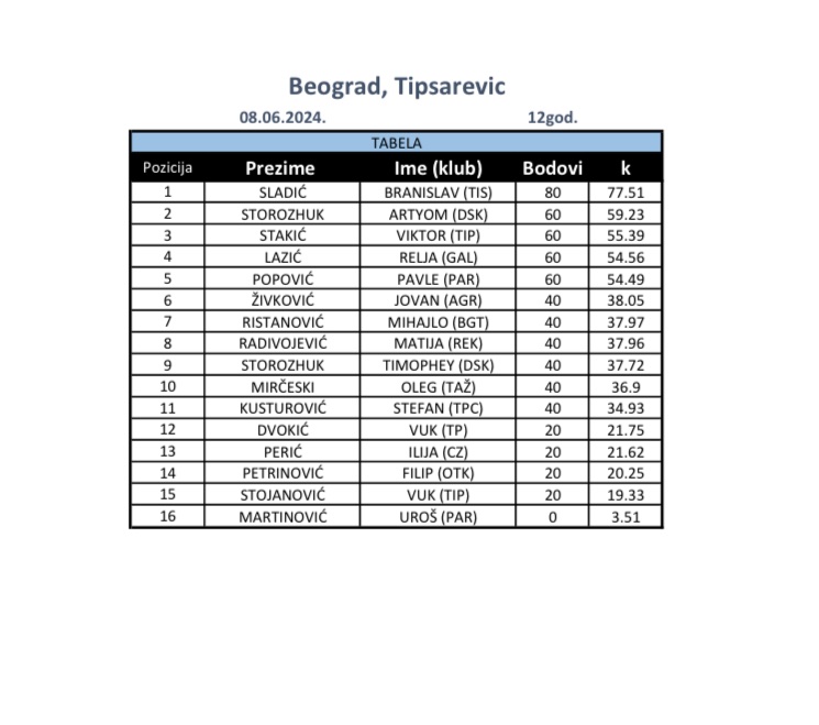 Branislav Sladić pobednik je turnira. Drugo mesto osvojili su: Artyom Storozhuk, Viktor Stakić, Relja Lazić i Pavle Popović.