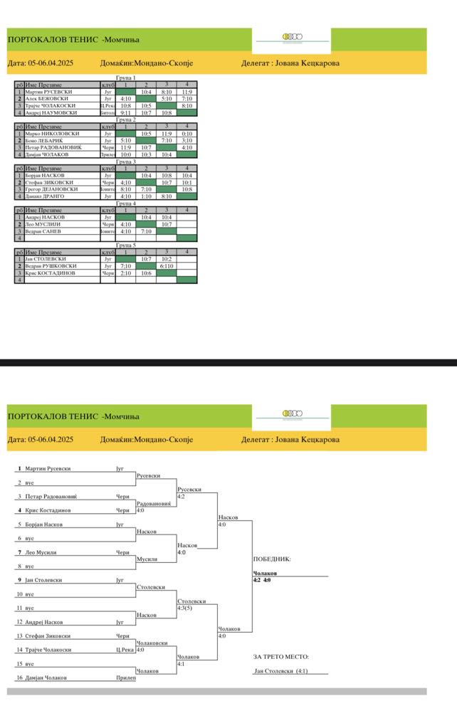 Damjan Čolakov pobednik e na turnirot za momčinja. Vtoroto mesto go osvoi Borjan Naskov, dodeka tretoto mesto go osvoi Jan Stolevski.