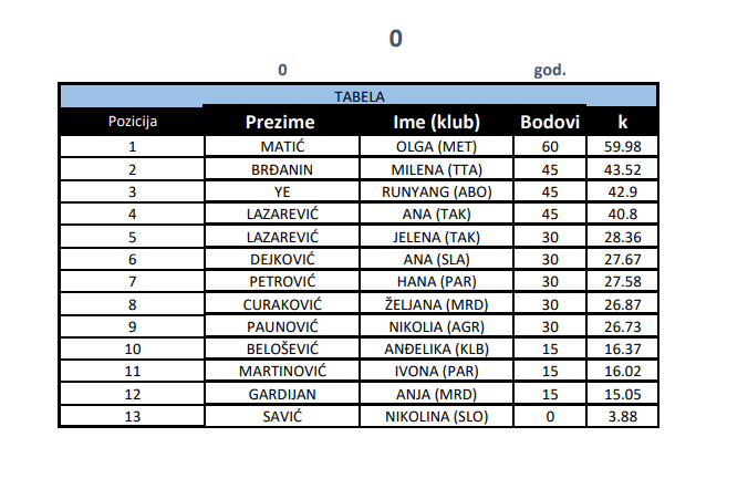 Olga Matić pobednica je turnira za juniorke. Drugo mesto osvojile su Milena Brđanin, Runyang Ye i Ana Lazarević.