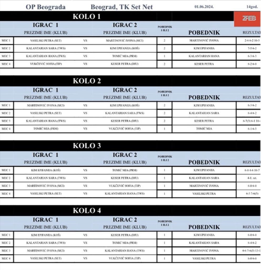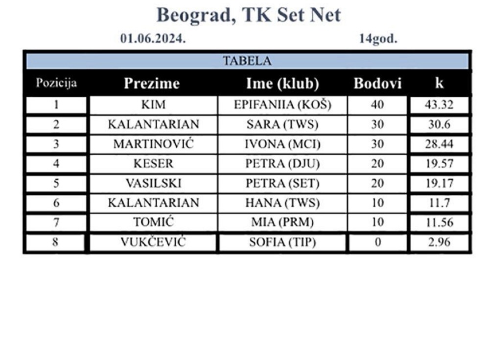 Детаљније Kim najbolja na SRB GPX – devojčice do 14g. – TK Set Net (B turnir), Beograd – 01.06.2024.