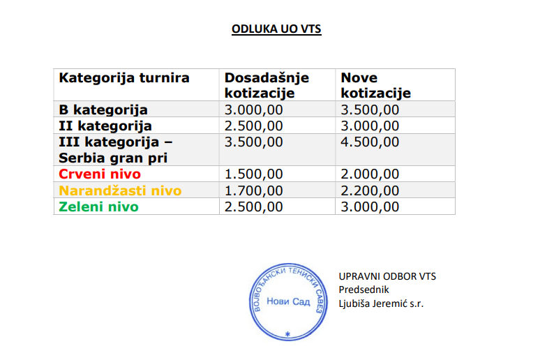 Na elektronskoj sednici Upravnog odbora Vojvođanskog teniskog saveza održane 08. novembra 2023. godine usvojena je odluka o visini kotizacija za zimskih turnira 2023./2024.