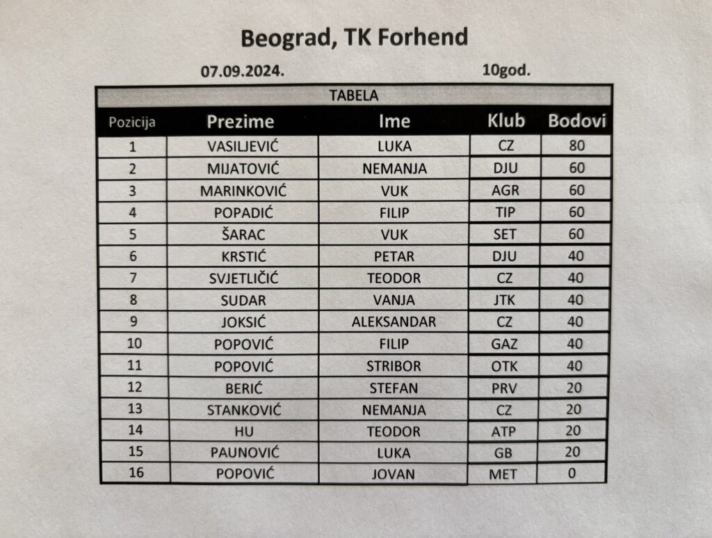 Детаљније Luka najbolji na SRB GPX za dečake do 10g. (zeleni nivo) – TK Forhend, Beograd, 07.09.2024.