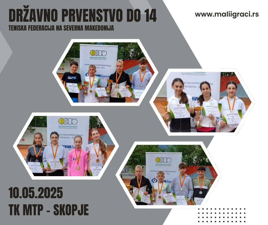 Predstojniov vikend od 10. maj 2025 godina, vo TK MTP – Skopje, se održuva Državno prvenstvo na Makedonija za momčinja i devojčinja dо 14 godini, оd kalendarot na Teniska federacija na Severna Makedonija. Sledete go turnirot na sajtot Mali Igrači!