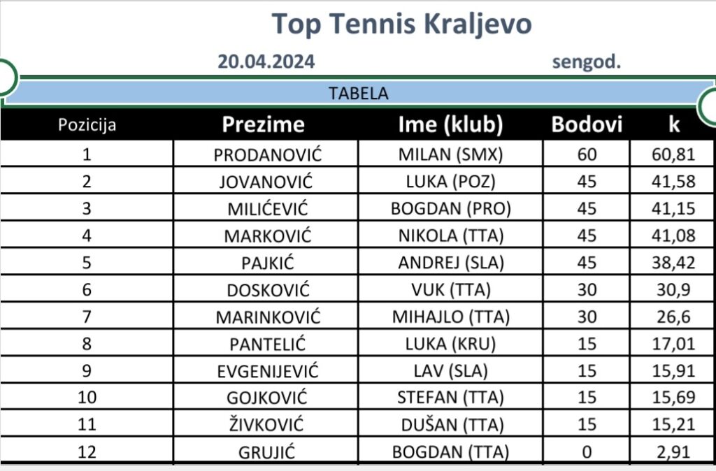 SERBIAN GRAND PRIX, turnir 3. kategorije za juniore do 16 godina, igra se od 20. i 21. aprila 2024. godine u TK Top Tenis, Kraljevo, u okviru kalendara Teniskog Saveza Zapadne Srbije i Šumadije. Pratimo turnir zajedno!