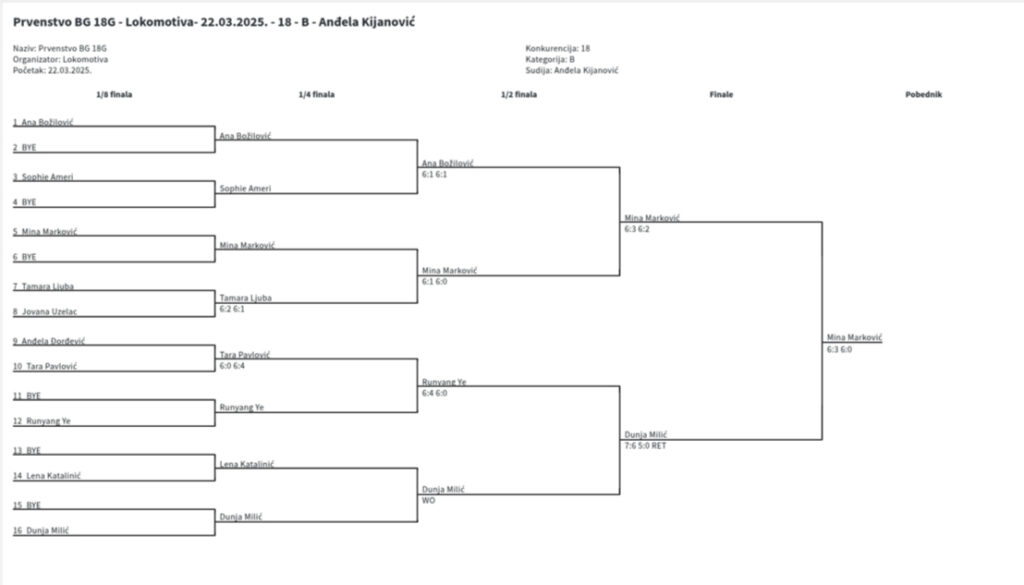 Prvenstvo Beograda, turnir B kategorije za juniorke do 18 godina igra se od 22. marta 2025. godine u TK Lokomotiva, Beograd, u okviru kalendara Teniskog saveza Beograda. Pratimo turnir. Budite uz Male igrače!