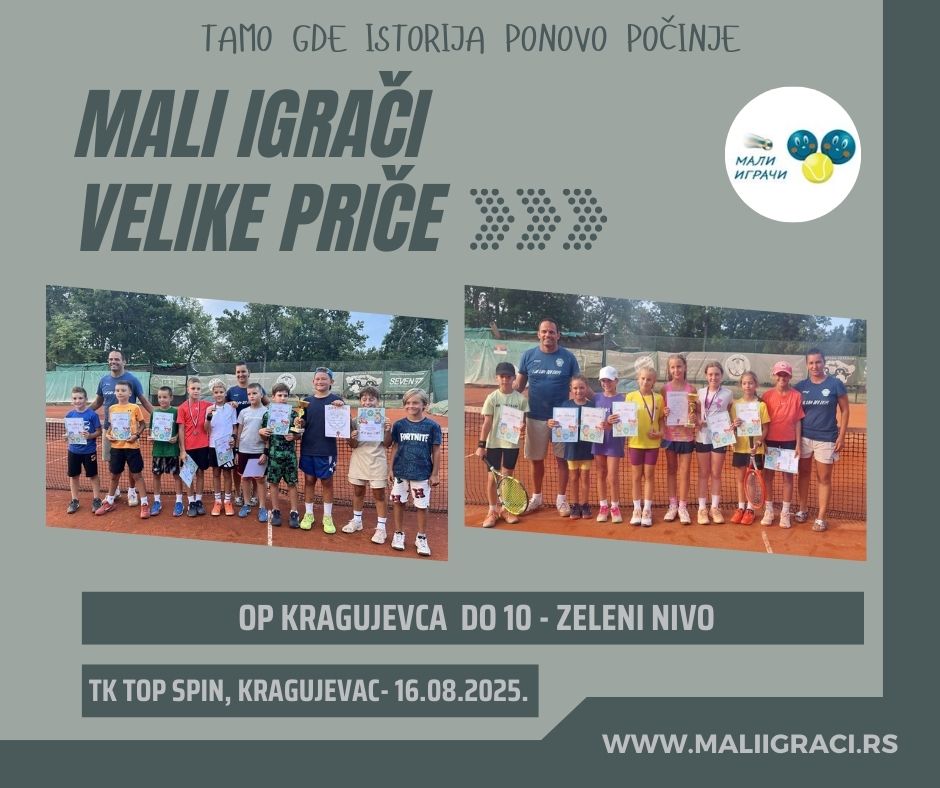 OP Kragujevca , turnir zelenog nivoa zа dečake i devojčice dо 10 godina, igra se 16. avgusta 2025. godine u ТK Top Spin, Kragujevac, u okviru kalendara Teniskog saveza Šumadije i zapadne Srbije. Turniri se igraju na šljaci. Budite uz Male Igrače!
