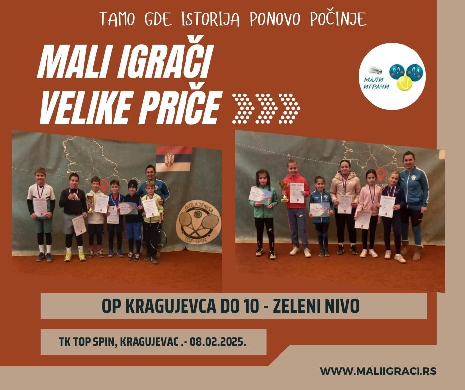 OP Kragujevca , turnir zelenog nivoa zа dečake i devojčice dо 10 godina, igra se od 08. februar 2025. godine u ТK Top Spin, Kragujevac, u okviru kalendara Teniskog saveza Šumadije i zapadne Srbije. Turniri se igraju na šljaci. Budite uz Male Igrače!