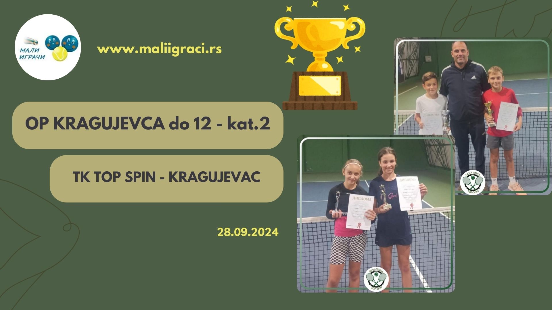 OP Kragujevca, turnir 2. kategorije za dečake i devojčice do 12 godina, igra se od 28. septembra 2024. godine u TK Top spin, Kragujevac, u okviru kalendara Teniskog Saveza Srbije. Pratimo turnir zajedno!