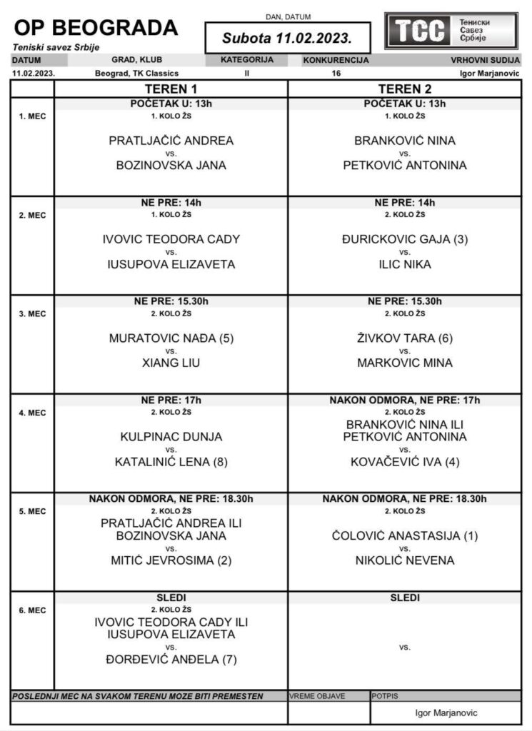 Otvoreno Prvenstvo Beograda, turnir 2. kategorije zа juniorke dо 16 godina, igra sе 11. i 12. februara 2023. godine u TK Classics, Beograd, u okviru kalendara Teniskog saveza Beograda. Turnir se igra na šljaci. Budite uz Male Igrače!