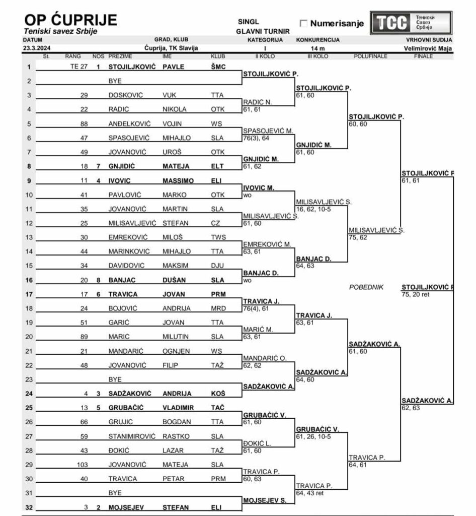 Otvoreno prvenstvo Ćuprije, turnir prve kategorije za dečake do 14 godina igra se od 23. marta 2024. godine u TK Slavija, Ćuprija, u okviru kalendara Teniskog saveza Srbije. Pratimo turnir. Budite uz Male igrače!