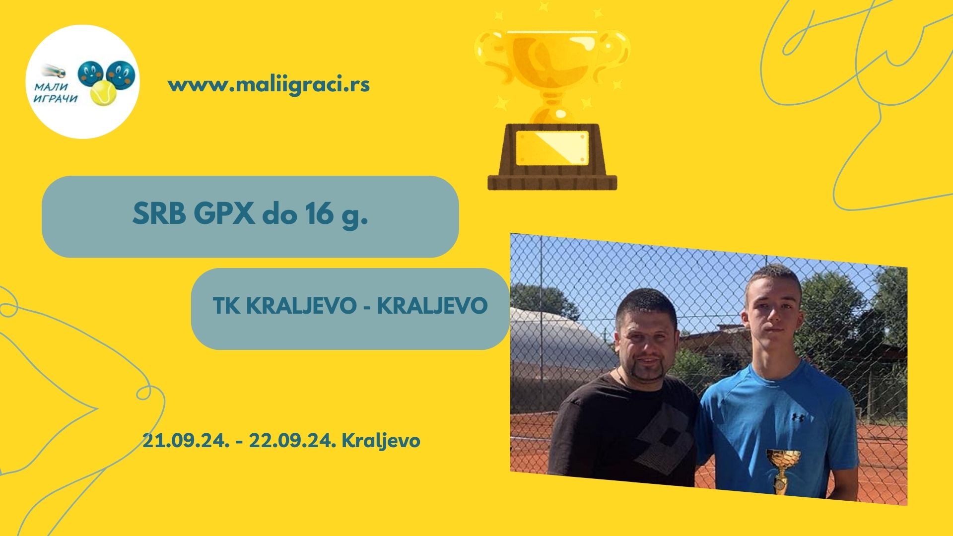 OP Kraljeva, SRB GPX dо 16 godina, juniori, igra sе 21. septembra 2024. godine u TK Kraljevo, Kraljevo, u okviru kalendara Teniskog saveza zapadne Srbije i Šumadije. Turnir se igra na šljaci. Budite uz Male Igrače!