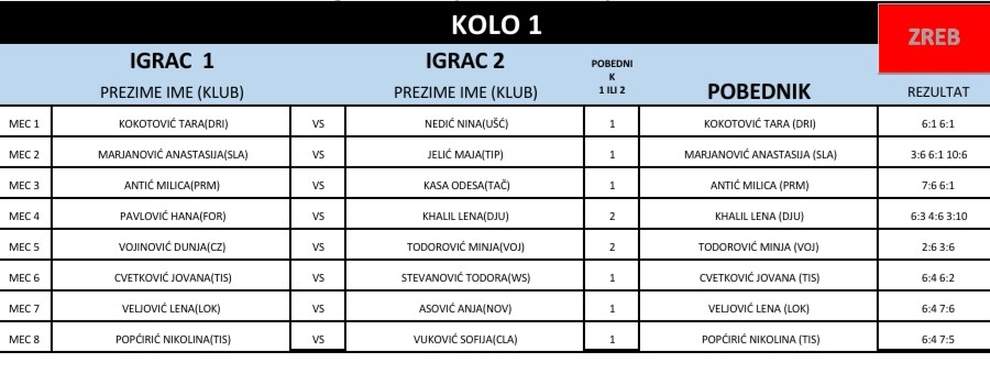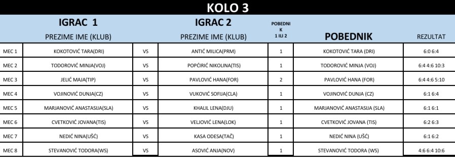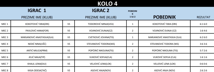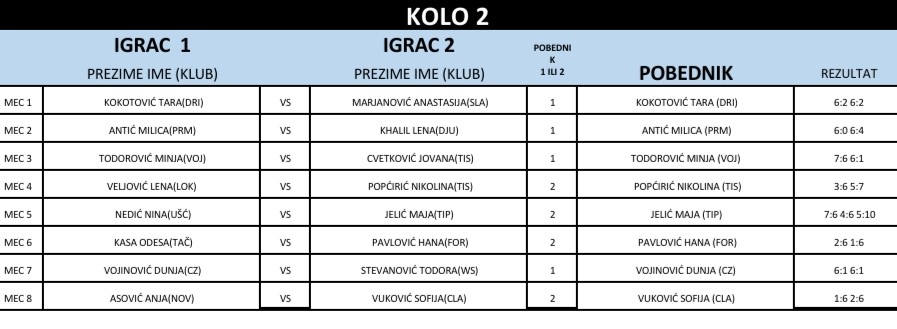 Победница турнира у ТК Типсаревић је Тара Кокотовић. Другопласиране су Анастасија Марјановић, Николина Попћирић и Дуња Војиновић.