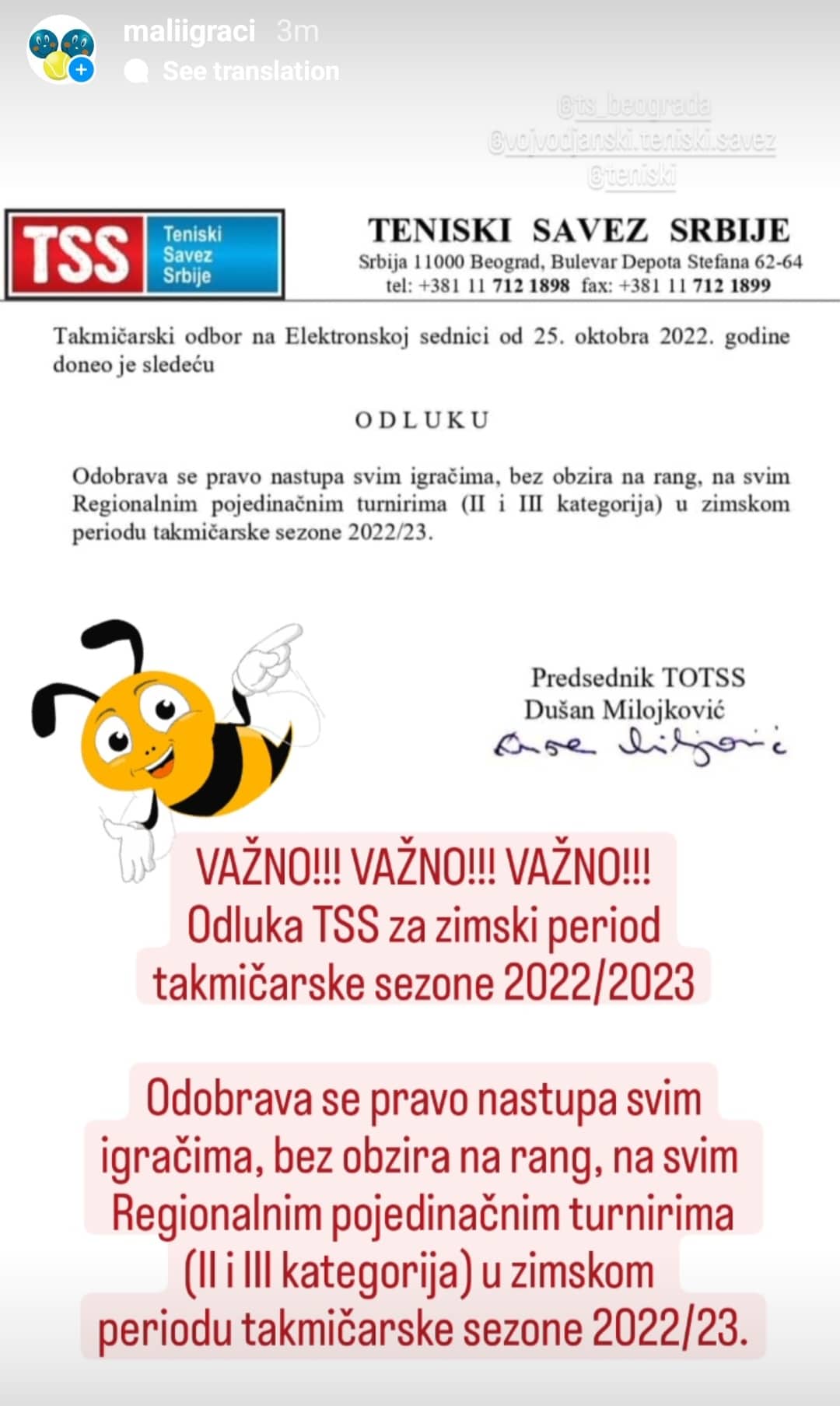 Тениски савез Србије на електронској седници Такмичарског одбора одржаној 25.10.2022 донео је следећу одлуку:
